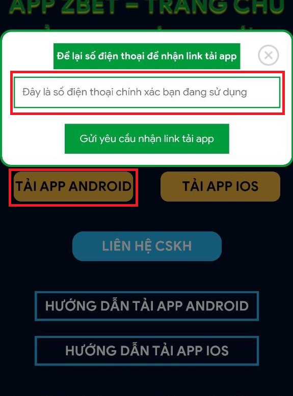 Bước 2: Bạn hãy chọn vào tải Zbet cho Android và nhập số điện thoại chính chủ hiện đang sử dụng của bạn vào.