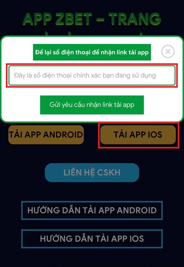 Bước 2: Nhấn vào ô App Zbet dành cho IOS và nhập số điện thoại của bạn vào mục yêu cầu. Sau khi nhập thành công chờ hệ thống tải và đưa bạn tới trang game dành riêng cho IOS.