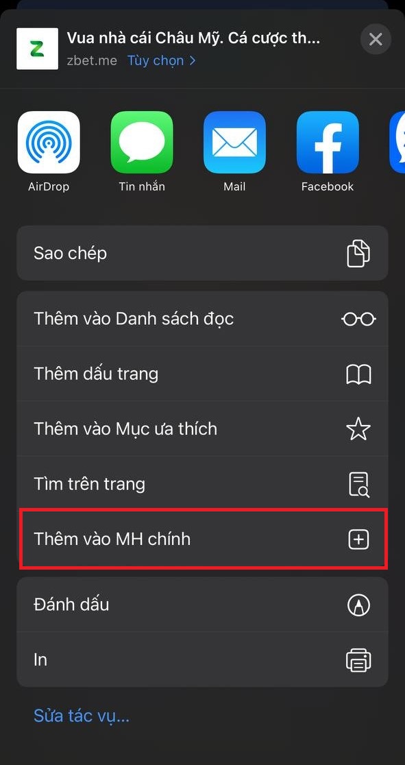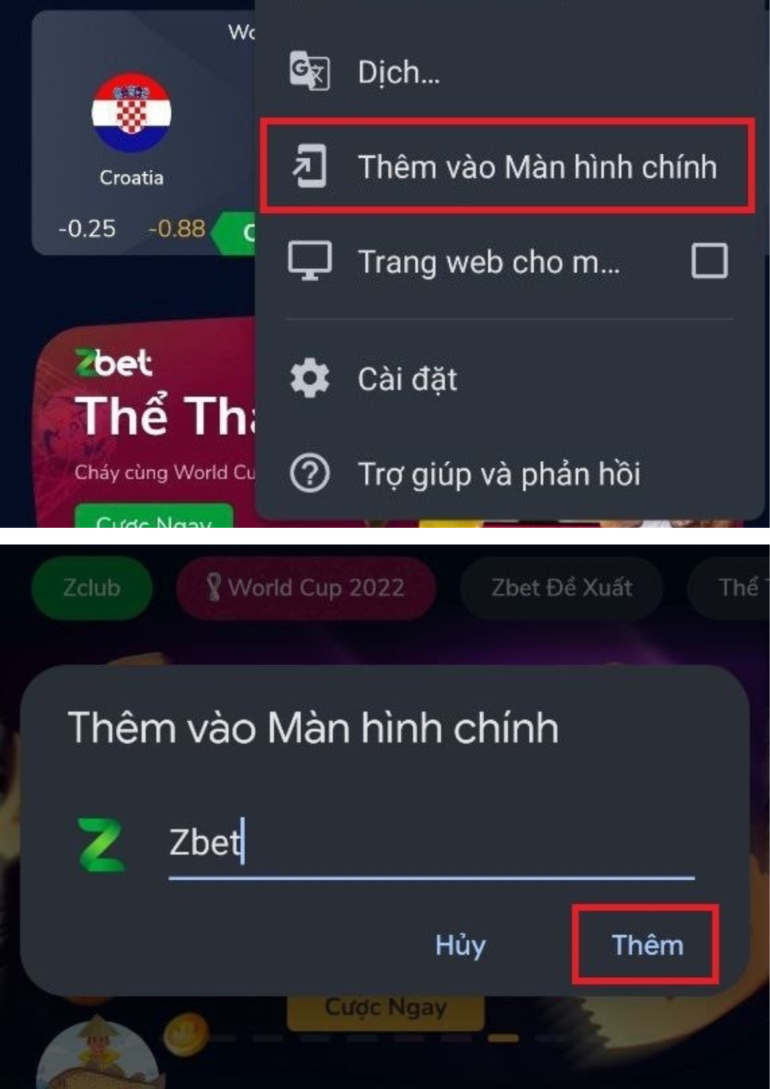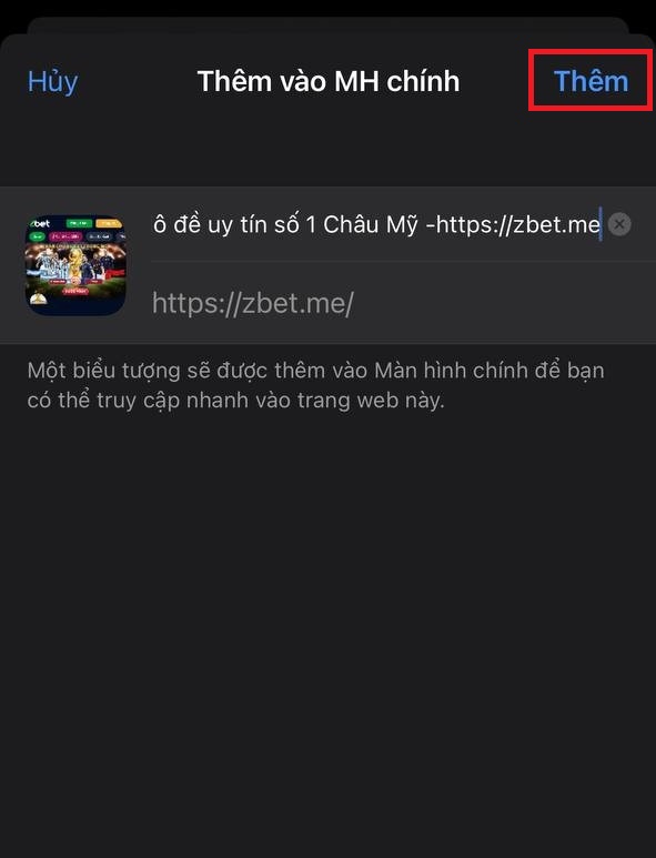 Bước 4: Tiếp tục bạn chọn “Thêm vào màn hình chính” và đặt tên cho app Zbet là bạn đã cài đặt thành công.